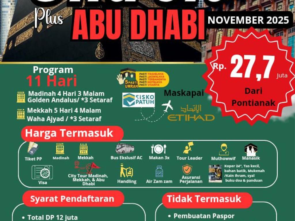 - Perlengkapan : Koper kabin, koper bagasi, tas paspor, kain ihram/mukena, sandal, buku manasik, kain seragam, syal, & sabuk