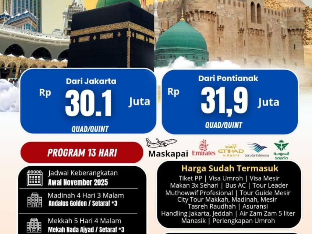- Perlengkapan Umroh (Koper 24", Tas Selempang, Syal, Bahan Batik, Kain Ihrom (Laki-laki), Mukenah, Buku Doa & Buku Panduan Manasik)
