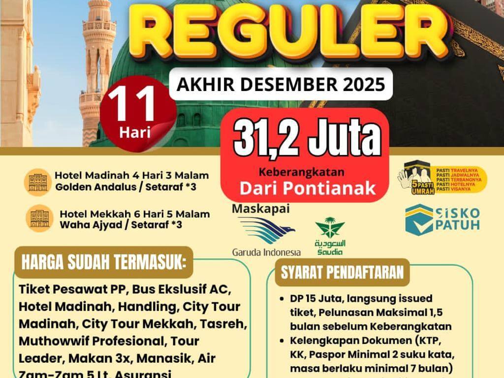 - Perlengkapan Umroh (Koper 24", Tas Selempang, Syal, Bahan Batik, Kain Ihrom (Laki-laki), Mukenah, Buku Doa & Panduan Manasik)