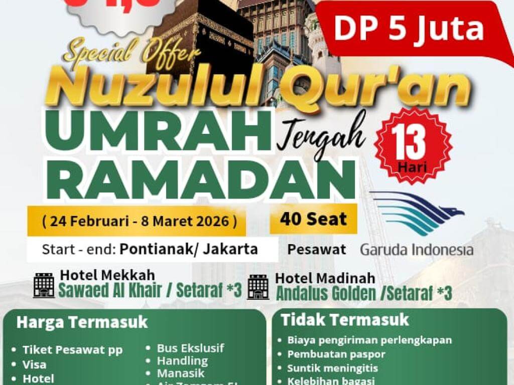 - Perlengkapan Umroh (Koper 24", Tas Selempang, Syal, Bahan Batik, Kain Ihrom (Laki-laki), Mukenah, Buku Doa & Panduan Manasik)