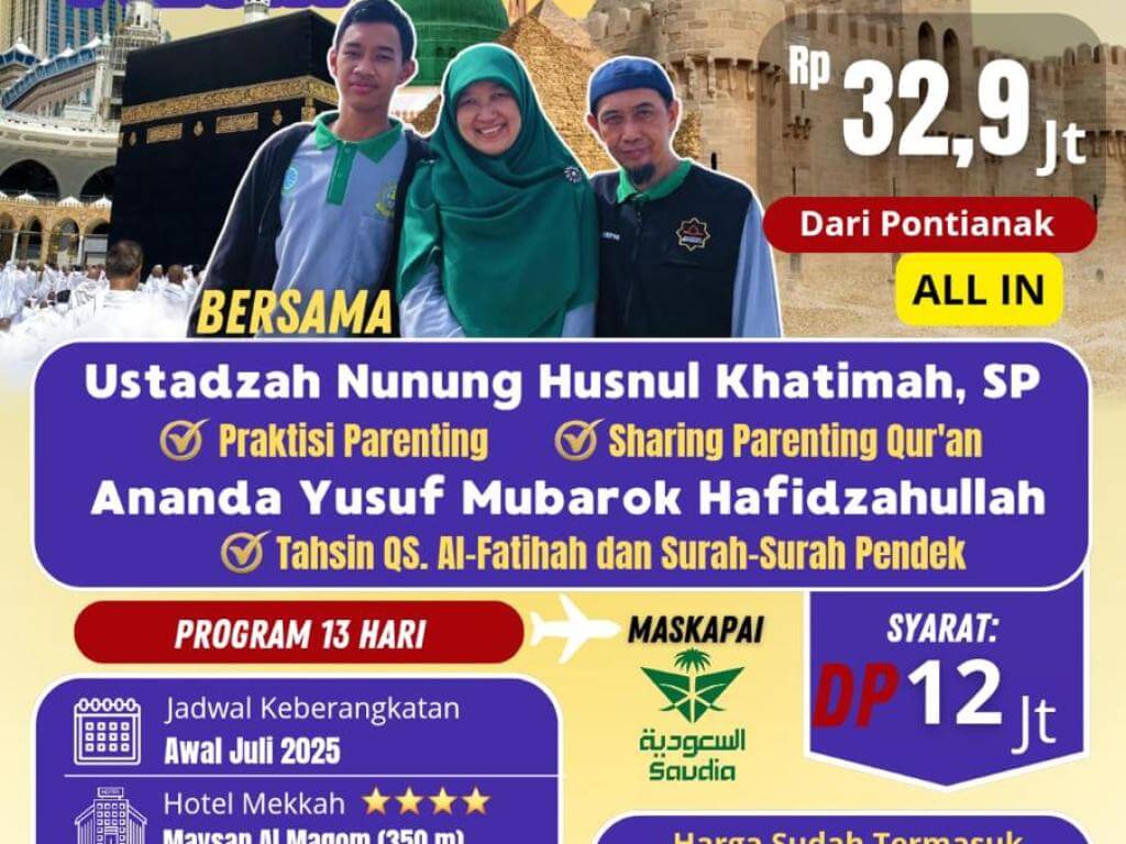 - Perlengkapan Umroh (Koper 24", Tas Selempang, Syal, Bahan Batik, Kain Ihrom (Laki-laki), Mukenah, Buku Doa & Panduan Manasik)